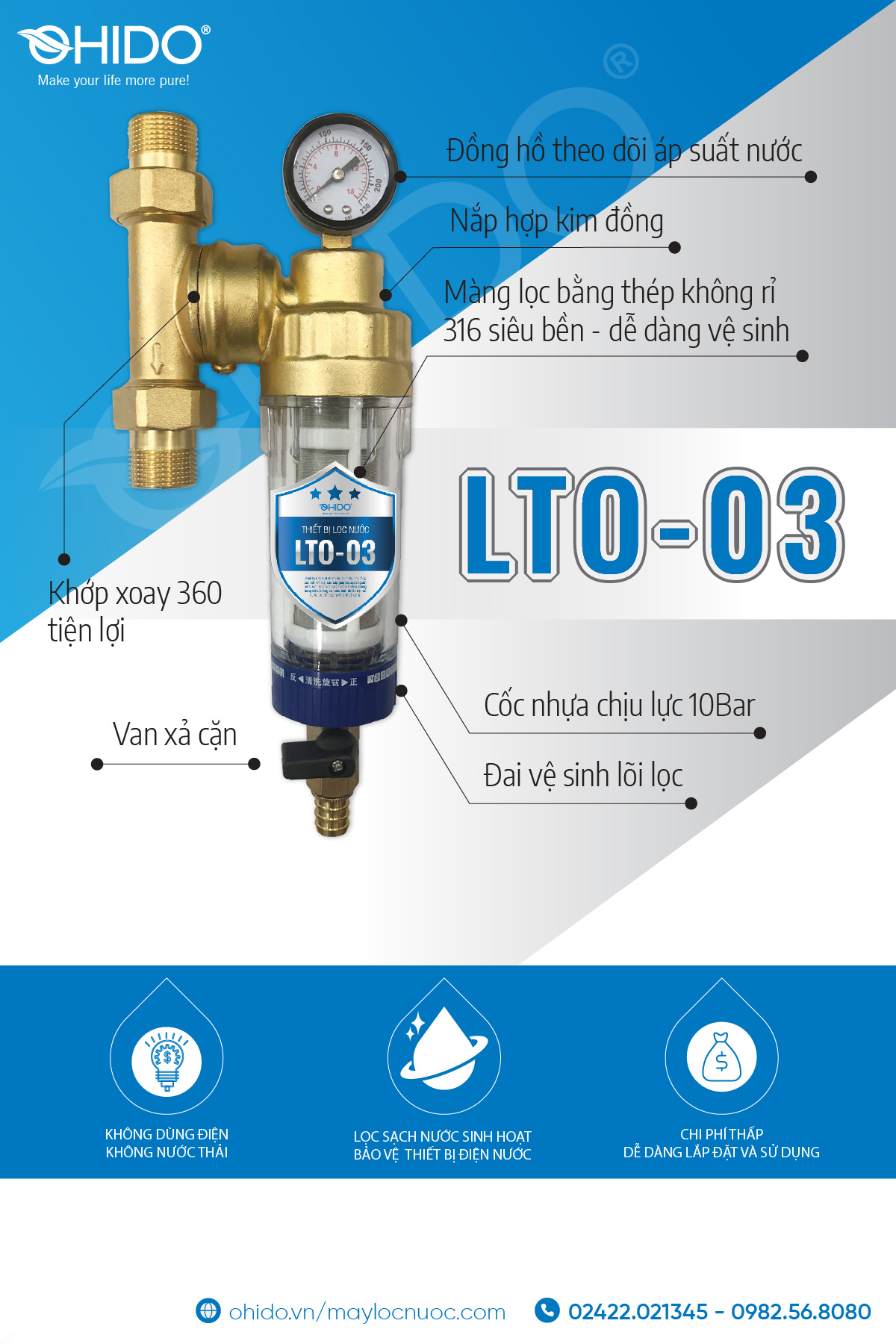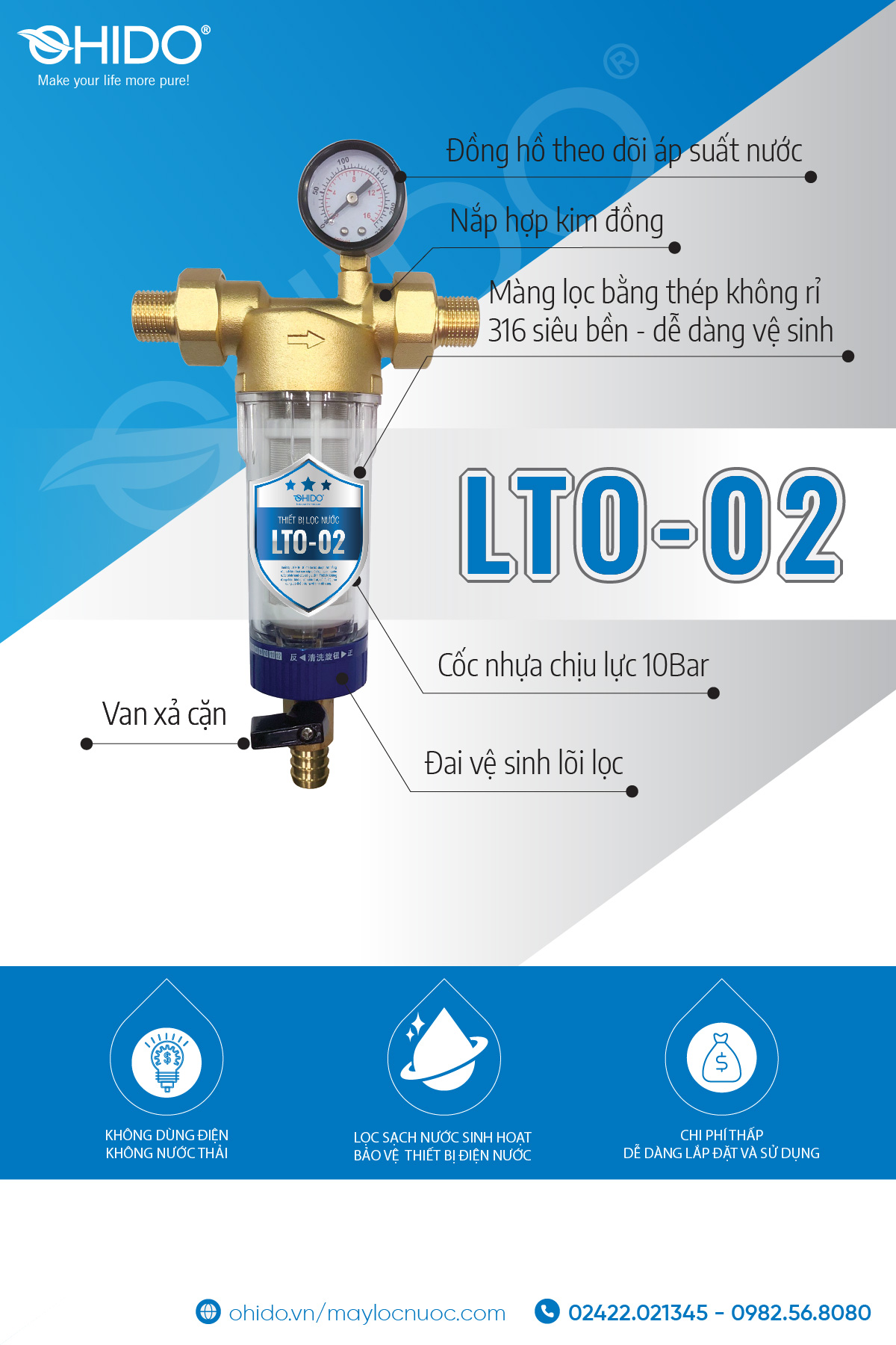 Thiết bị lọc đầu nguồn LTO có đồng hồ đo áp lực nước, cho biết tình trạng hoạt động của thiết bị đã tới lúc cần vệ sinh hay chưa.